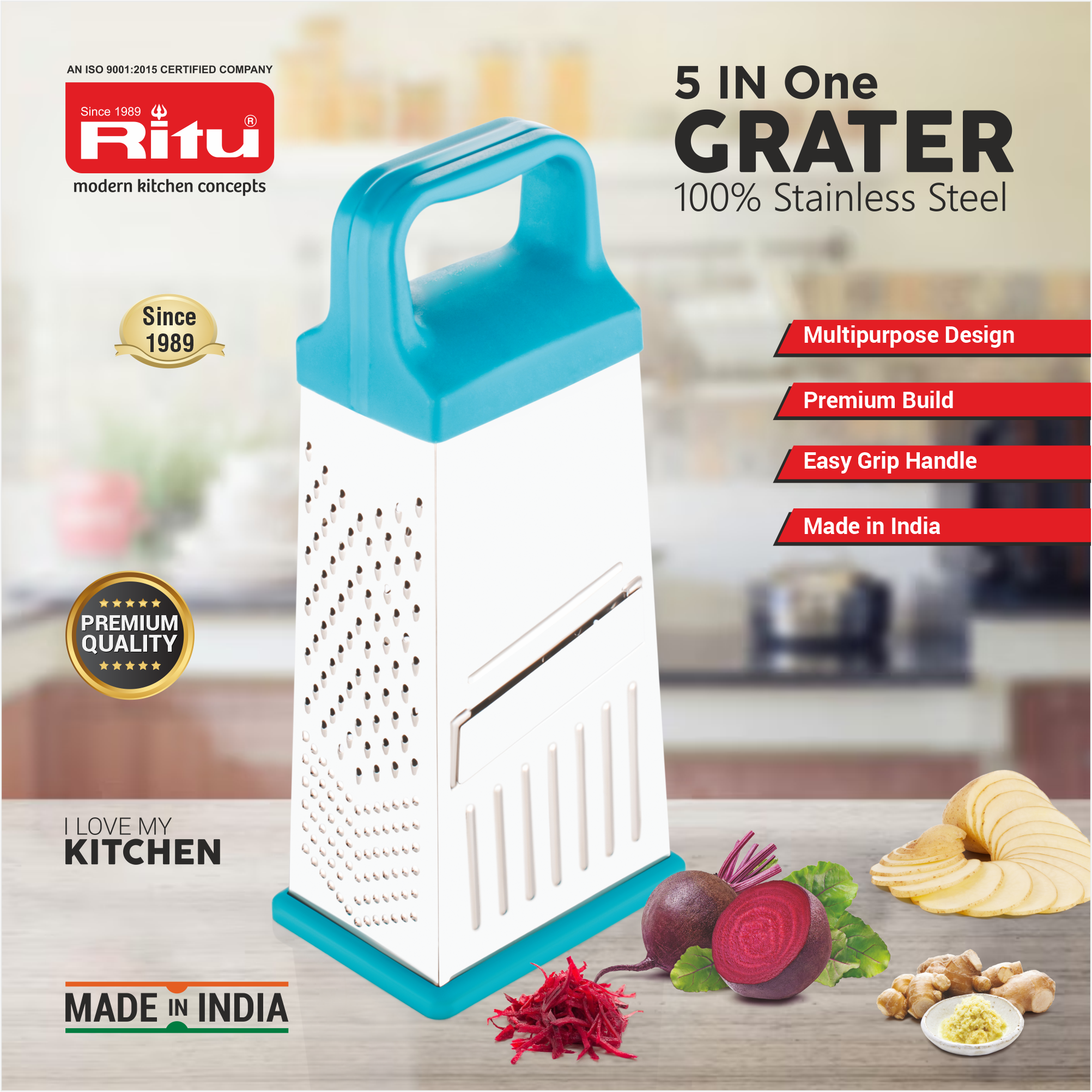 5 IN ONE GRATER 100% STAINLESS STEEL 1. THIN SLICER 2. THICK GRATER 3. GINGER GRATER 4. THIN GRATER 5. CHEESE GRATER